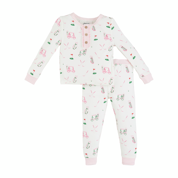 The Pink Golf Toddler Pajama Set is a delightful 2-piece ensemble that is perfect for your little one. Made from a soft and cozy knit bamboo fabric, these long pajamas provide ultimate comfort for a restful night's sleep. The ruffle detailing adds a touch of charm, while the coconut wood button placket adds a stylish and unique element to the design. Crafted with care, these pajamas are made from high-quality cotton material, ensuring durability and long-lasting wear. Available up to a size 5T, this adorable pajama set is a must-have for any toddler's wardrobe.